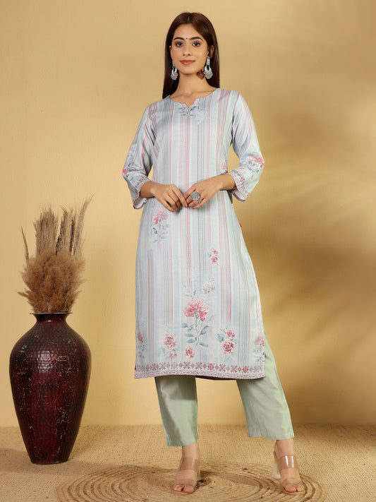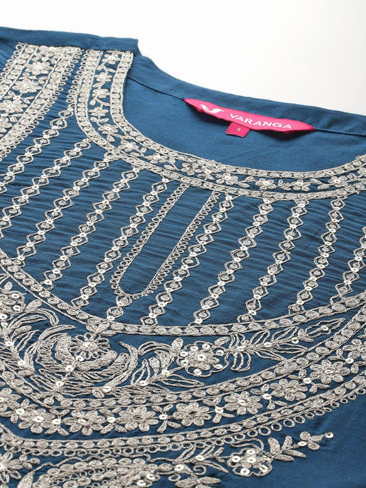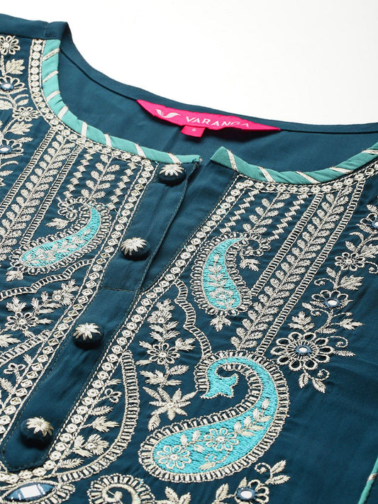 Dhiyona VA Women'sBlue Floral Embroidered Mirror Work Straight Kurta With Trousers & Dupatta