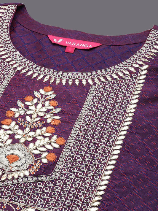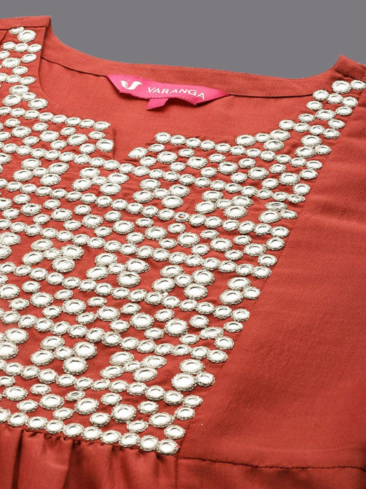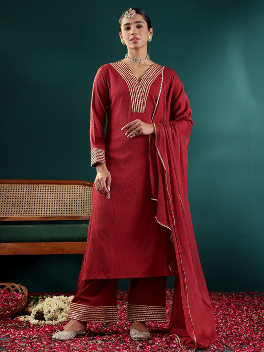 Dhiyona VA Women'sMaroon V-Neck Regular Gotta Patti Silk Crepe Kurta With Trouser With Dupatta