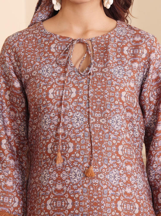 Buy 2 Get 1 FreeVendor:Dhiyona VADhiyona VA Women'sBrown Floral Printed Tie Up Neck High Low Kurta With Trousers