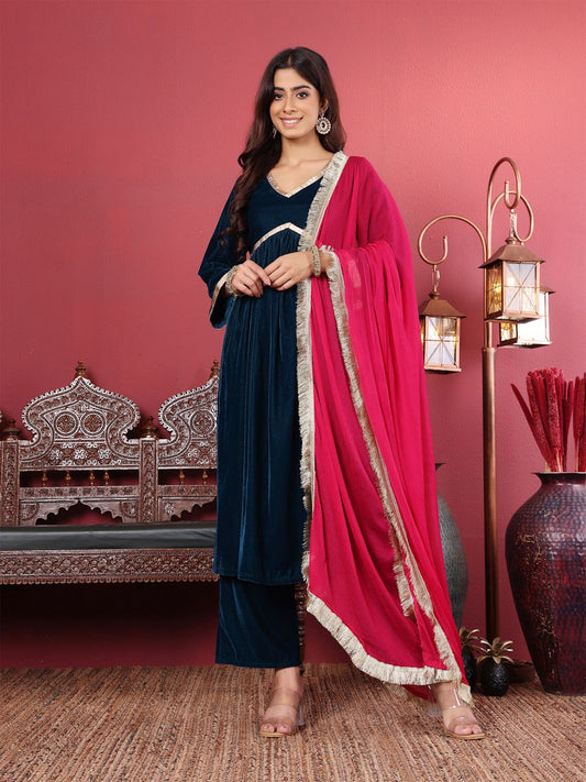 Dhiyona VA Women'sNavy Blue Flared Sleeves Lace Velvet Empire Kurta with Trousers & Dupatta