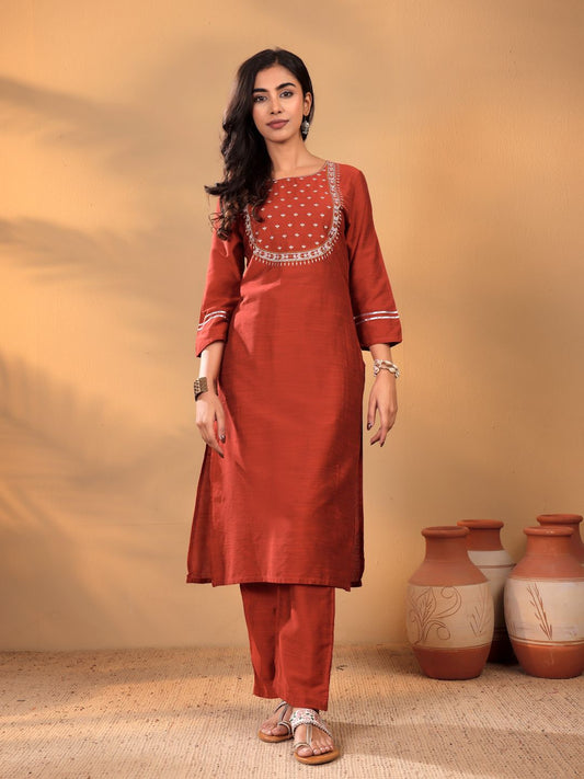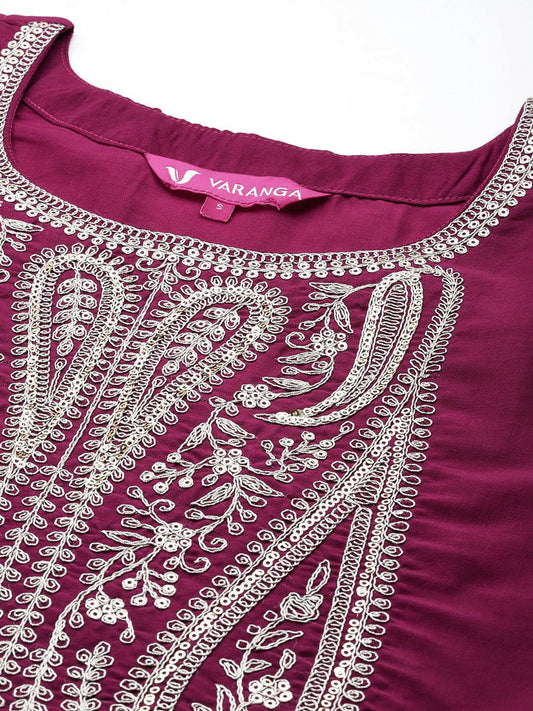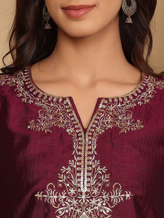 Dhiyona VA Women'sMaroon Floral Yoke Design Thread Work Straight Kurta With Trousers & Dupatta