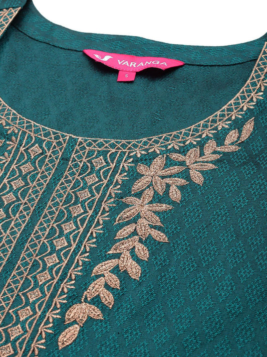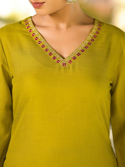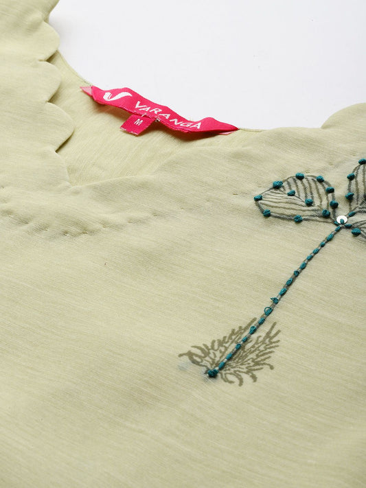 Dhiyona VA Women'sGreen Embroidered V-Neck Flared Sleeves Straight Kurta With Trousers