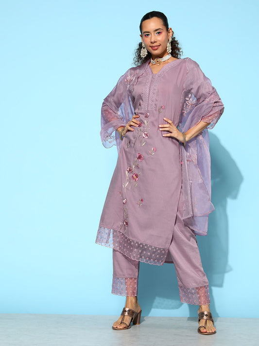 Dhiyona VA Women's Mauve Floral Embroidered Thread Work Kurta With Trousers & Dupatta