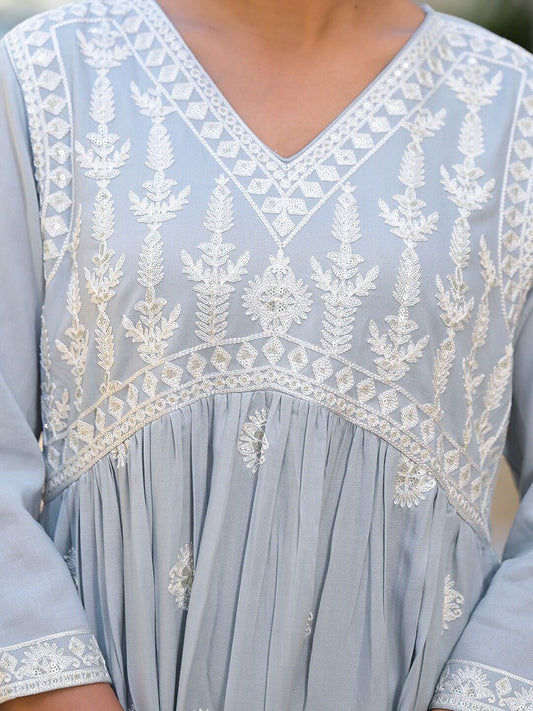 Dhiyona VA Women's Grey Embroidered Sequinned Silk Georgette Kurta with Sharara & With Dupatta