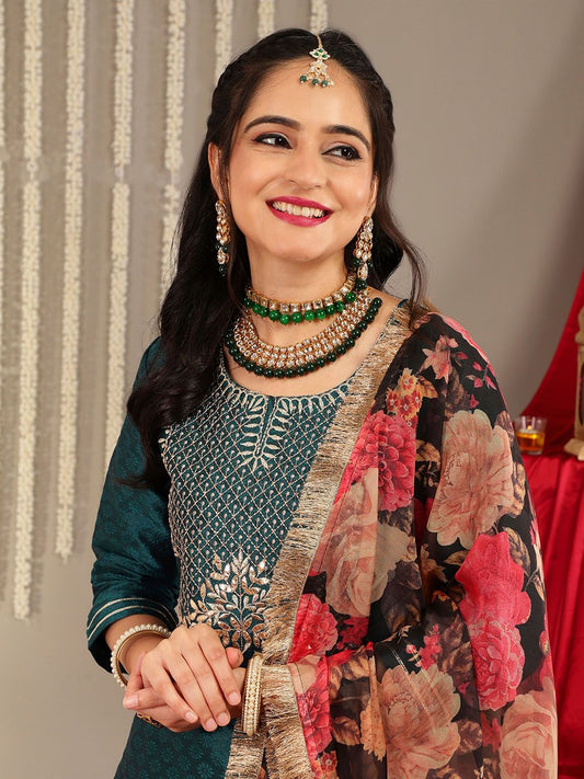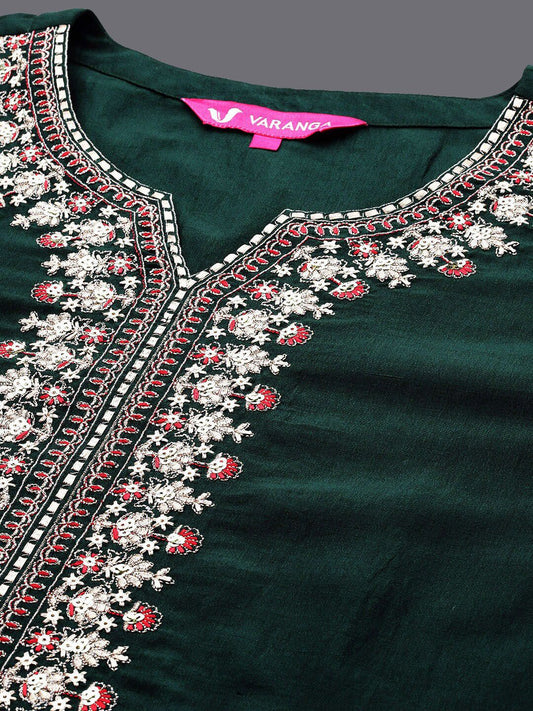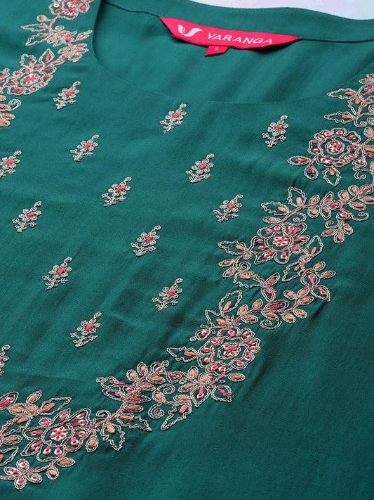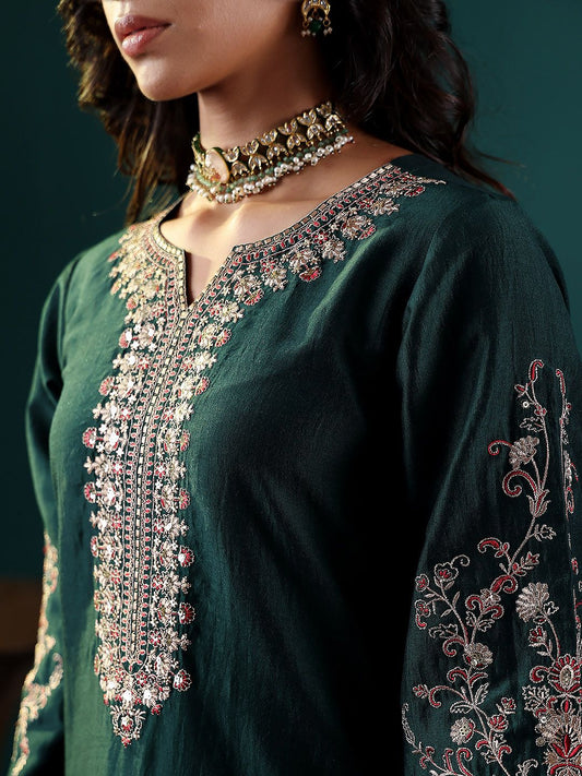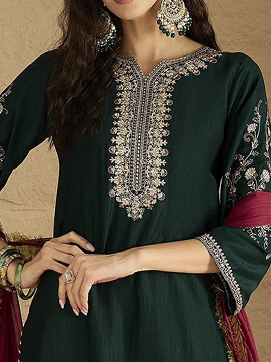 Dhiyona VA Women'sGreen Floral Embroidered Regular Sequinned Kurta With Trouser With Dupatta