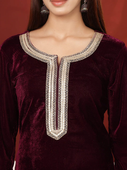 Dhiyona VA Women'sEmbroidered Zari Velvet Straight Kurta With Sharara