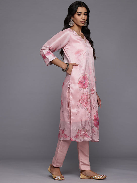 Dhiyona VR Women's Pink Silk Floral Printed Beads And Stones Embellished Kurta Set With Dupatta