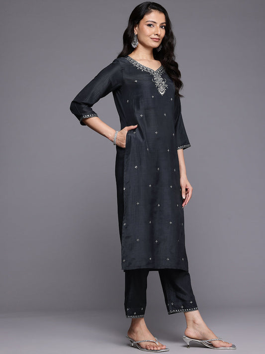 Dhiyona VR Women's Grey Silk Thread And Zari Embroidered , Sequins Embellished Kurta Paired With Bottom And Dupatta
