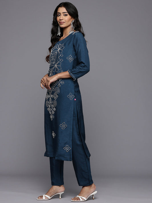 Dhiyona VR Women's Navy Blue Hand Embroidered Straight Kurta With Trousers And Embroidered Dupatta