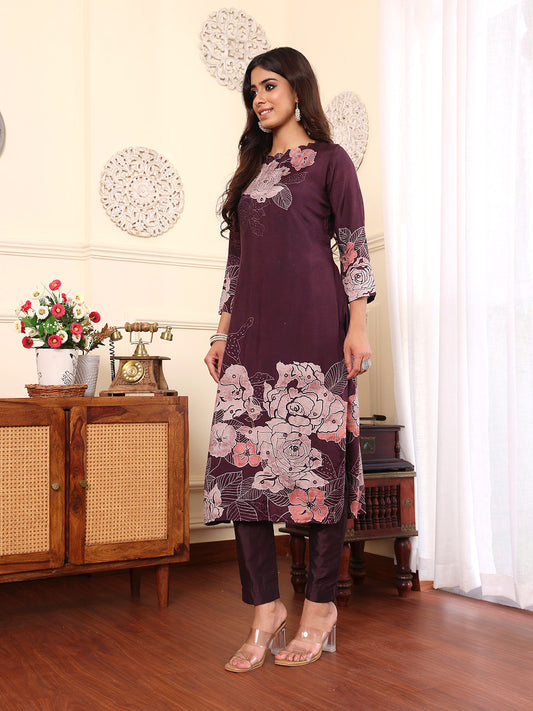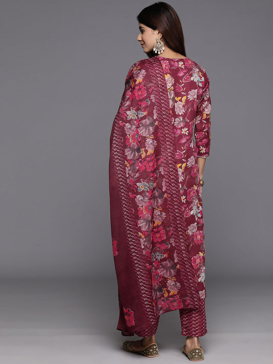 Dhiyona VR Women's Maroon Floral Printed Embroidered Kurta Paired With Bottom And Dupatta
