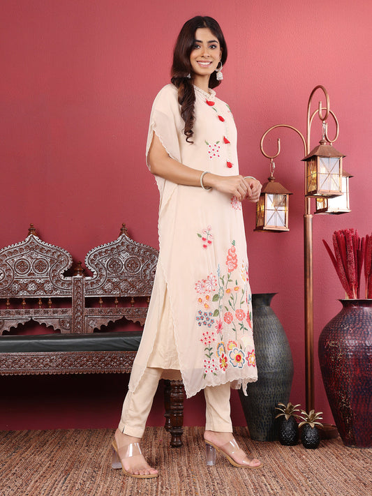 Dhiyona VR Women's Beige Pure Hand Kantha Embroidered Kurta Set With Dupatta