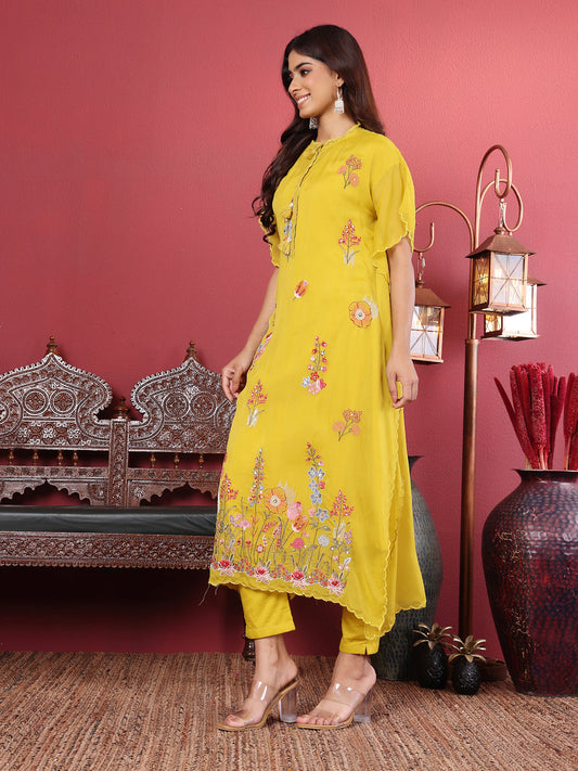 Dhiyona VR Women's Silk Kantha Hand Embroidered Kurta Set With Embroidered Dupatta