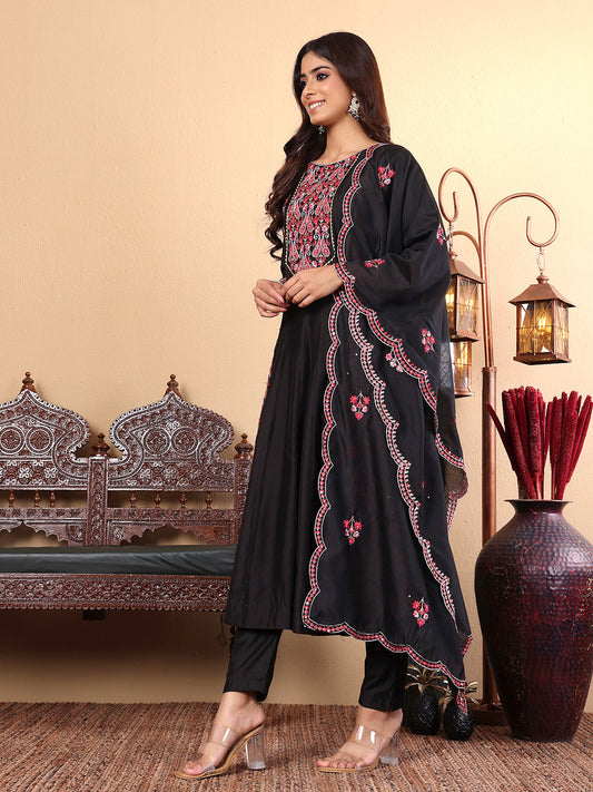 Dhiyona VR Women's Black Thread And Sequins Embroidered Kurta With Bottom And Dupatta