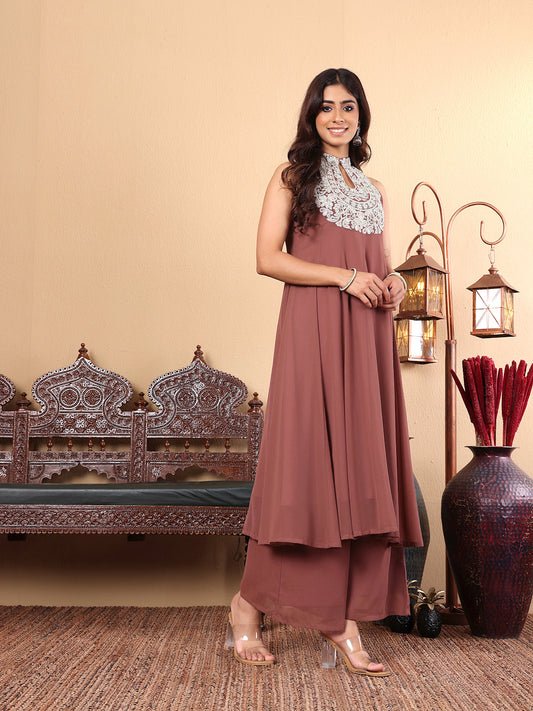 Buy 2 Get 1 FreeVendor:Dhiyona VRDhiyona VR Women's Nude Yoke Embroidered Sleeveless Flared Kurta With Trousers