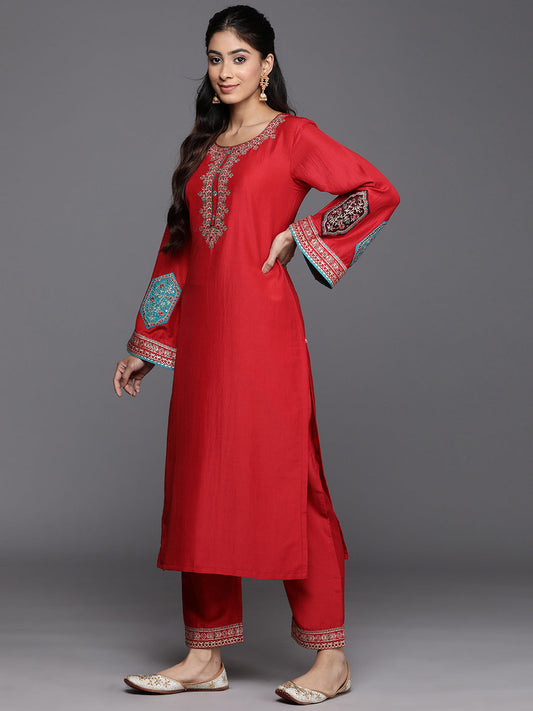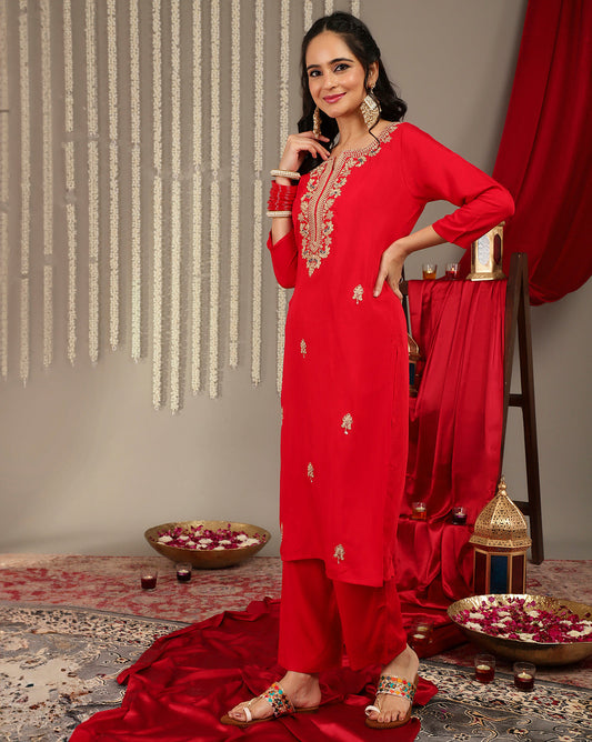 Dhiyona VR Women's Red Embroidered Straight Kurta Paired With Tonal Bottom And Contrast Dupatta With Four Sided Fringes