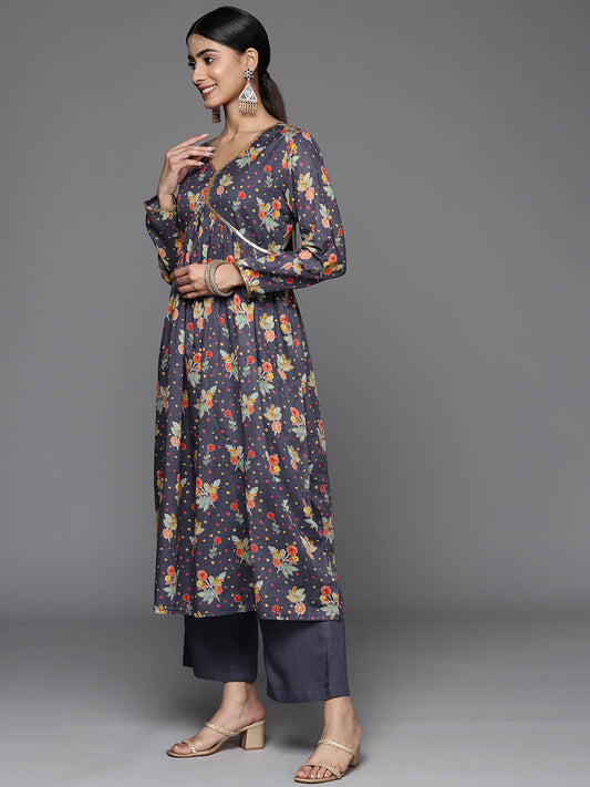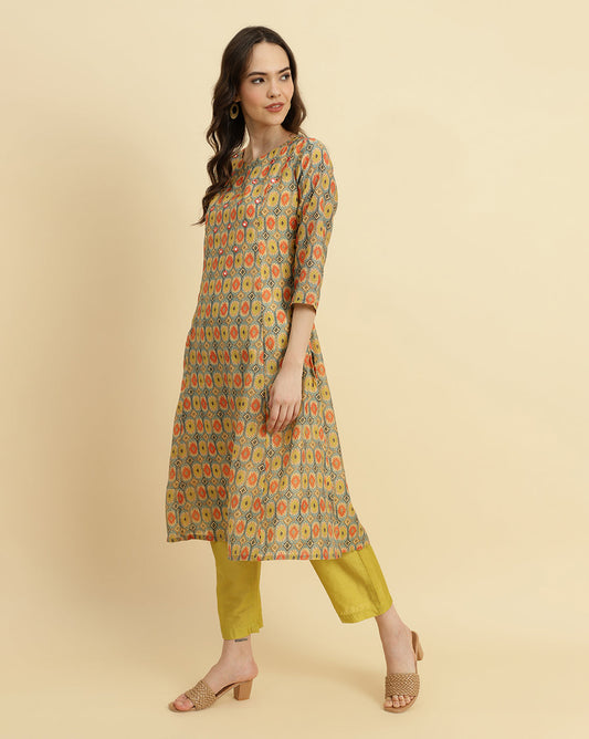 Dhiyona VR Women's Ikat Printed A-Line Mirror Embroidered Kurta Paired With Straight Trouser And Dupatta