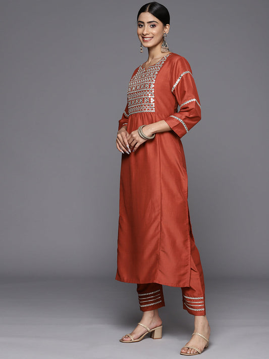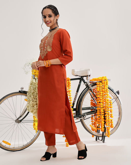 Dhiyona VR Women's Rust Mirror Work Yoke Embroidered Straight Kurta Paired With Tonal Bottom And Tonal Solid Dupatta With Four Side Fringes