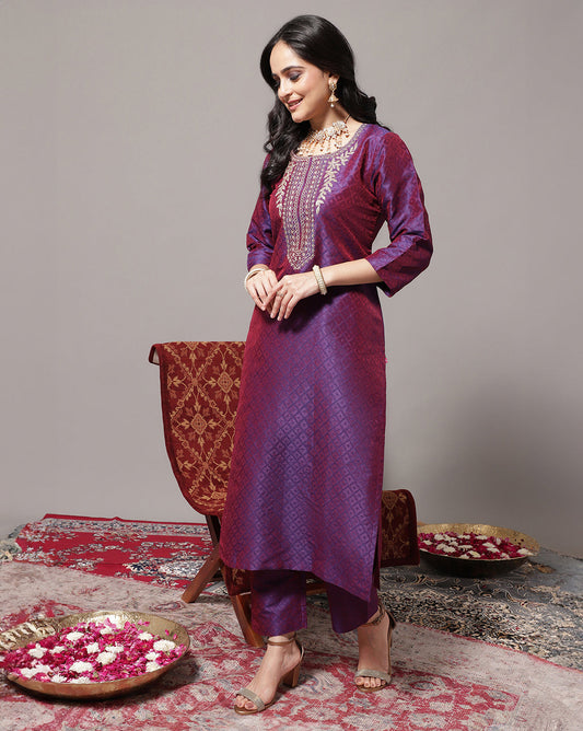 Dhiyona VR Women's Voilet Zari Embroidered Kurta With Three Quater Sleeves Paired With Tonal Bottom And Dupatta