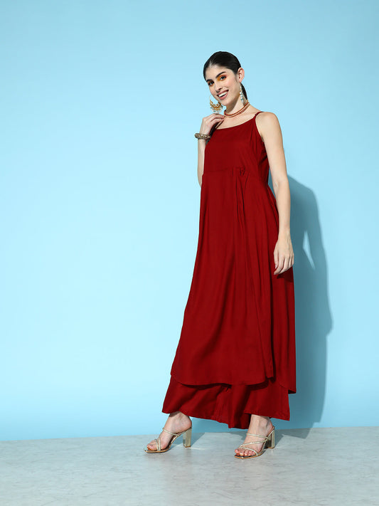 Dhiyona VR Women's Maroon Strap Style A Line Kurta Paired With Tonal Bottom And Contrast Floral Printed Dupatta With Four Sided Fringes