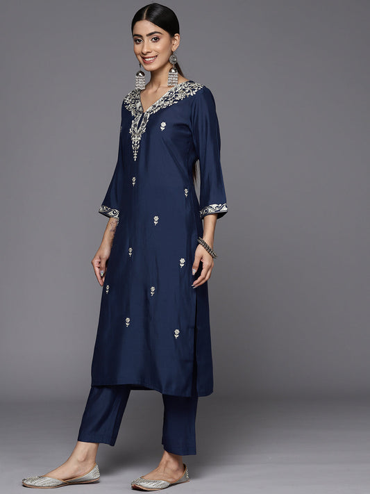Dhiyona VR Women's Blue & Silver Sequinned Yoke Design Kurta With Trousers & Dupatta