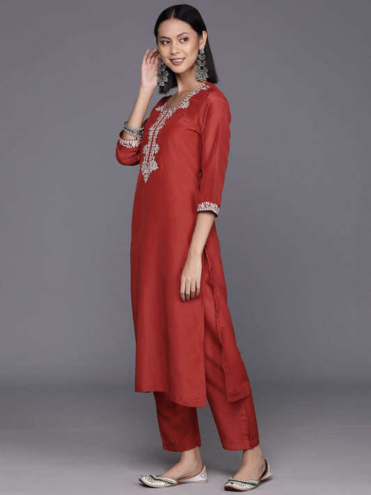 Dhiyona VR Women's Rust Zari Kurta With Solid Trouser And Dupatta Set