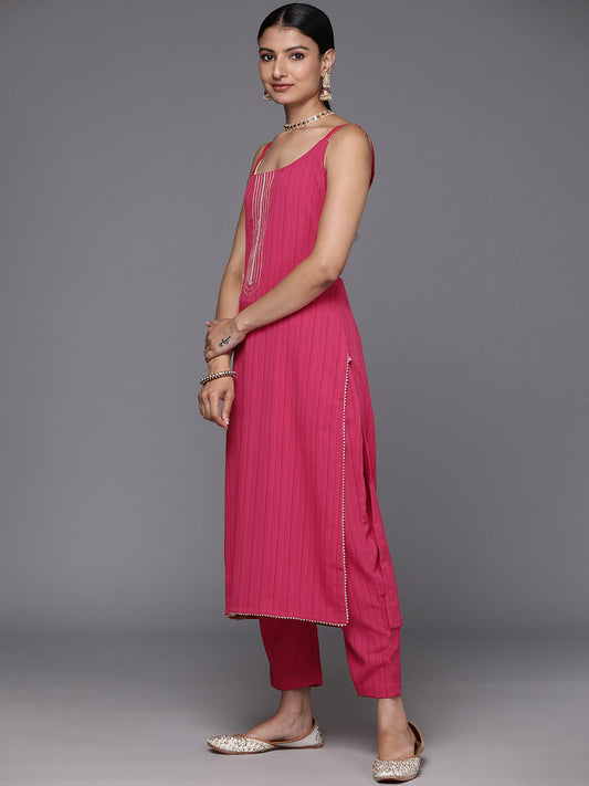 Dhiyona VR Women's Pink Round Neck, Spaghetti Strap Style Straight Kurta Paired With Tonal Bottom And Dupatta