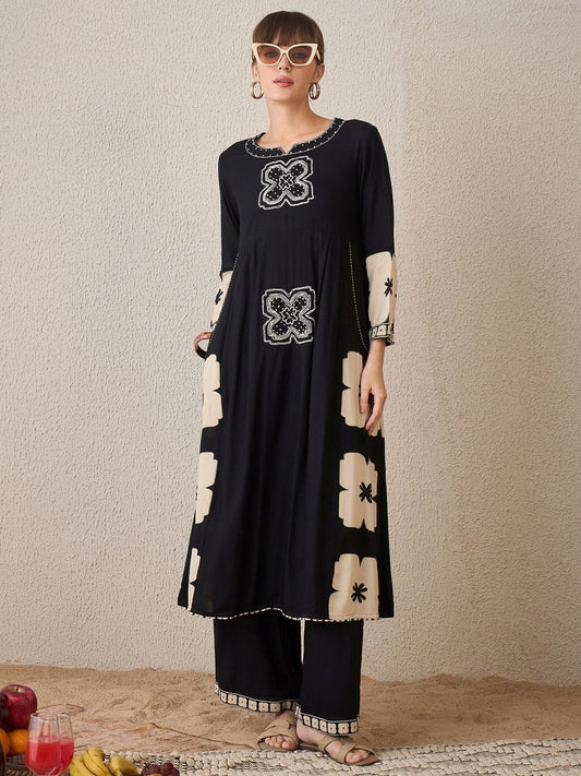 Dhiyona IE Floral Embroidered Notch Neck Empire Thread Work A-Line Kurta With Palazzo