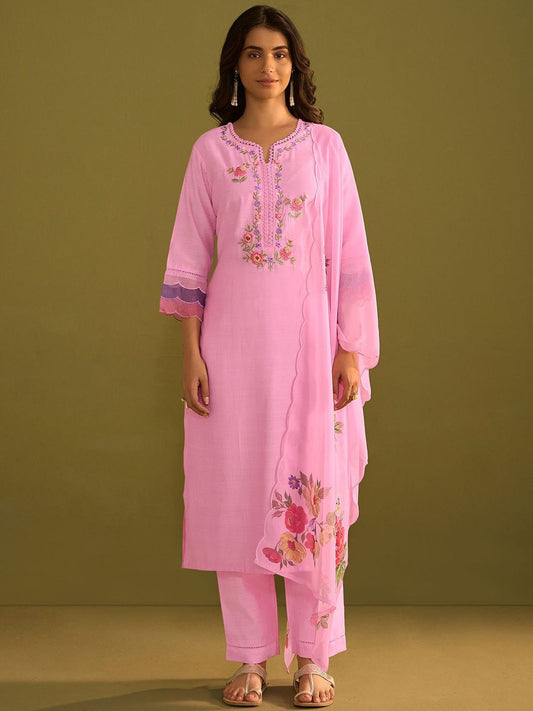 Dhiyona IE Floral Embroidered Thread Work Straight Kurta With Trousers & Dupatta