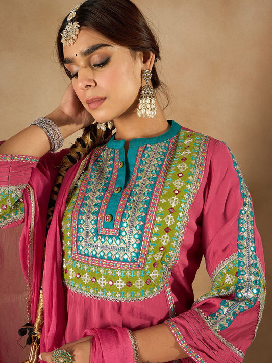 Dhiyona IE Leheriya Embroidered Thread Work Chanderi Silk Kurta With Trousers & Dupatta
