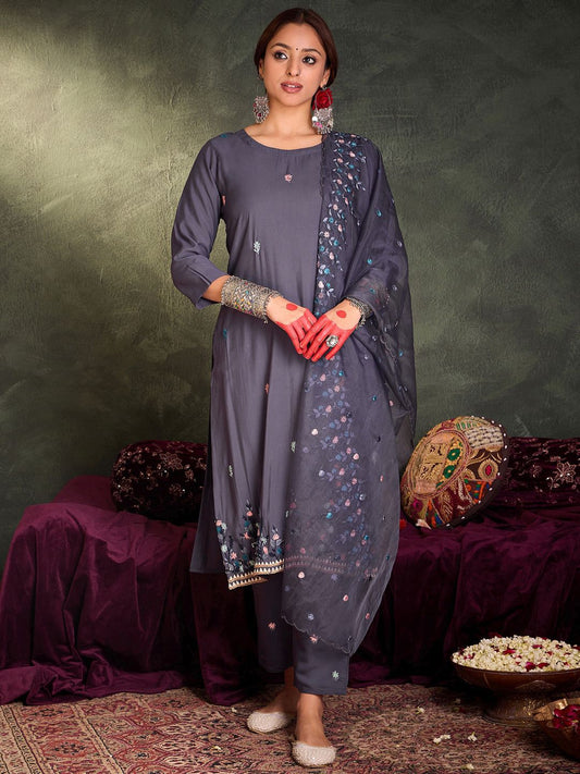 Dhiyona IE Floral Embroidered Regular Thread Work Kurta With Trouser & Dupatta
