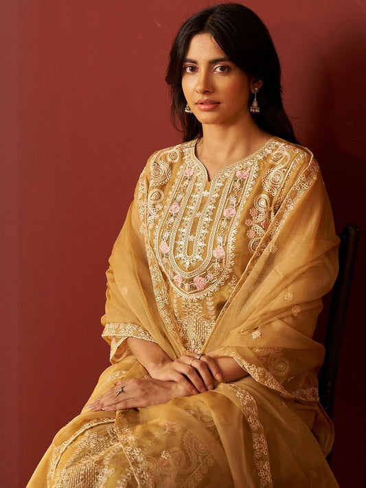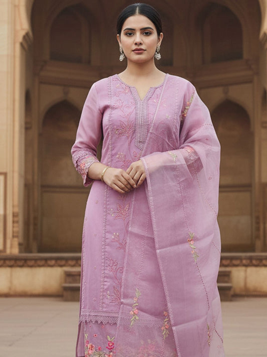Dhiyona IE Floral Embroidered Straight V-Neck Thread Work Kurta & Trousers Dupatta