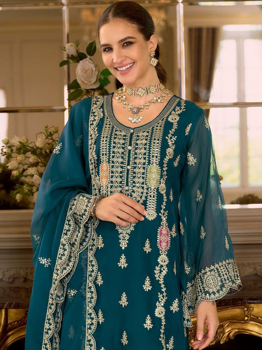 Dhiyona IE Floral Embroidered Thread Work Straight Kurta With Palazzo & Dupatta