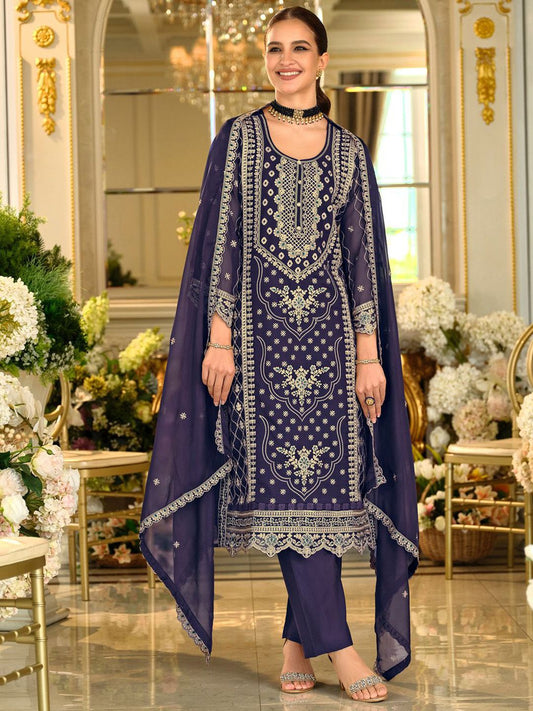Dhiyona IE Floral Embroidered Notch Neck Sequinned Straight Kurta With Trousers & Dupatta
