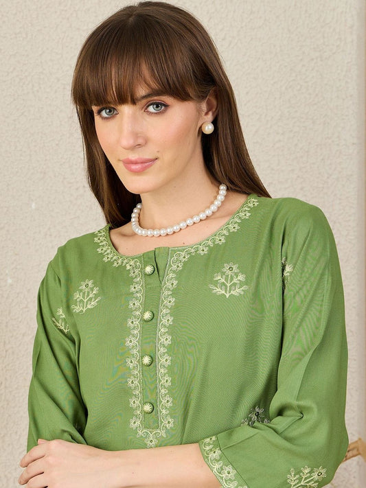 Dhiyona IE Floral Embroidered Round Neck Thread Work Straight Kurta & Trousers