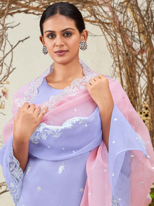 Dhiyona IE Lavender Floral Embroidered Round Neck Thread Work Kurta with Trousers & Dupatta