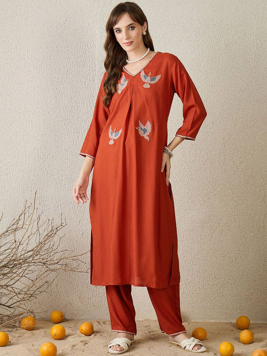 Dhiyona IE Women Embroidered V-Neck Kurta & Trouser Co-Ord Set