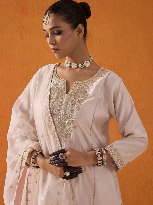Dhiyona IE Women Embroidered Regular Chanderi Silk Kurta with Trousers & With Dupatta