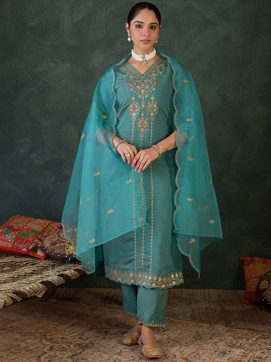 Dhiyona IE Floral Embroidered Notch Neck Thread Work Organza Kurta With Trousers & Dupatta