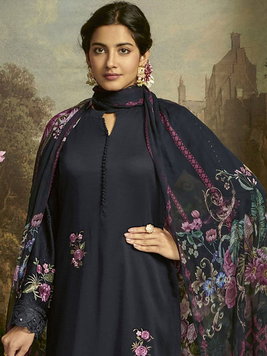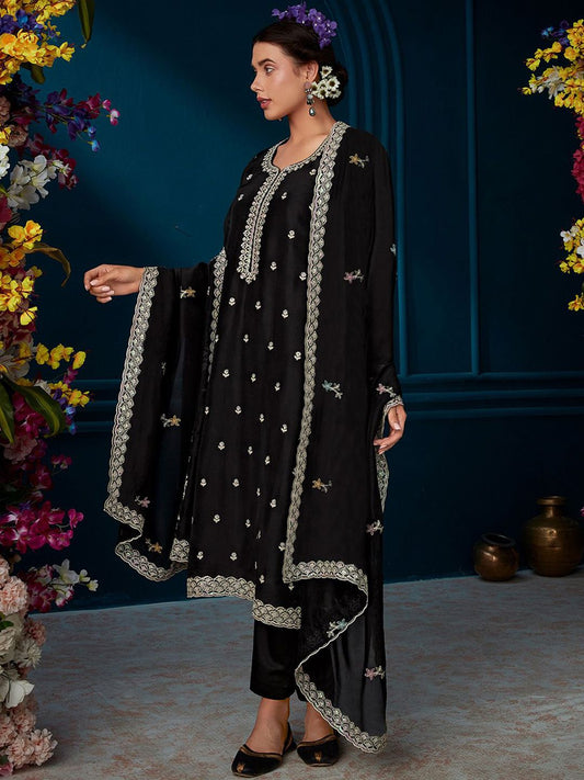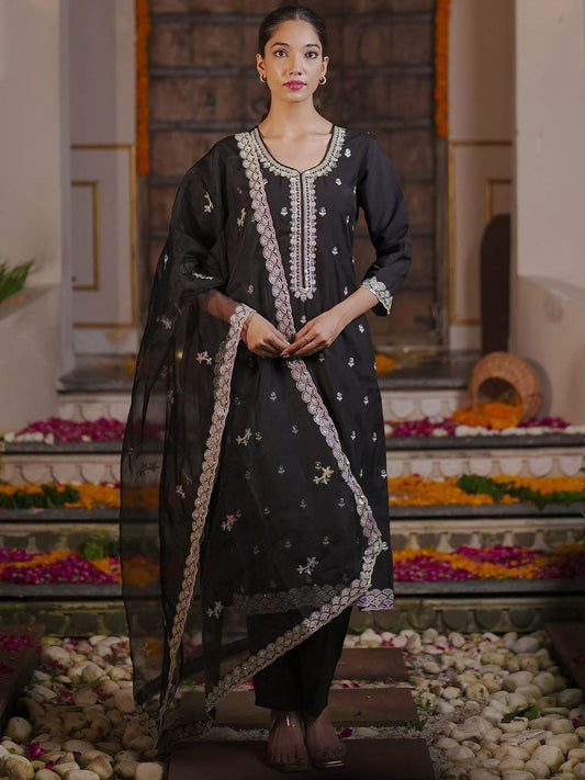 Dhiyona IE Floral Embroidered Sequinned Chinon Straight Kurta With Trousers & Dupatta