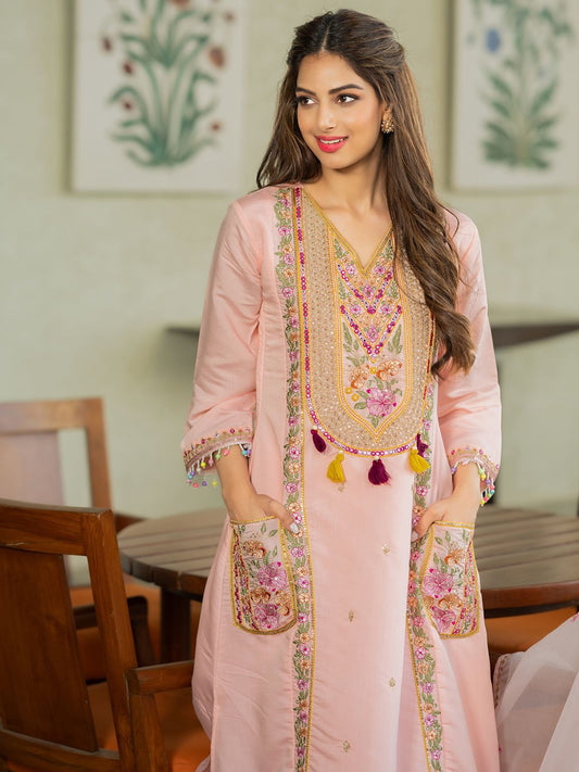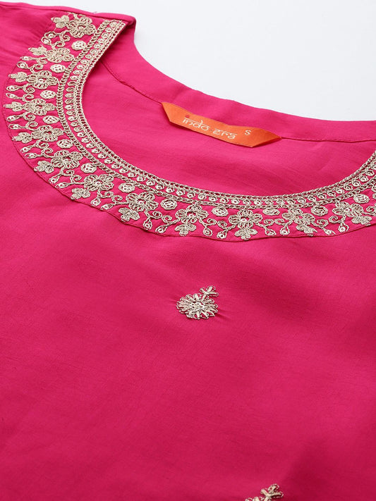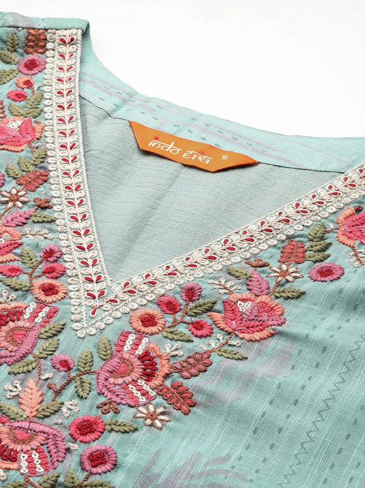 Dhiyona IE Floral Embroidered Notch Neck Sequinned Linen Kurta With Trousers & Dupatta