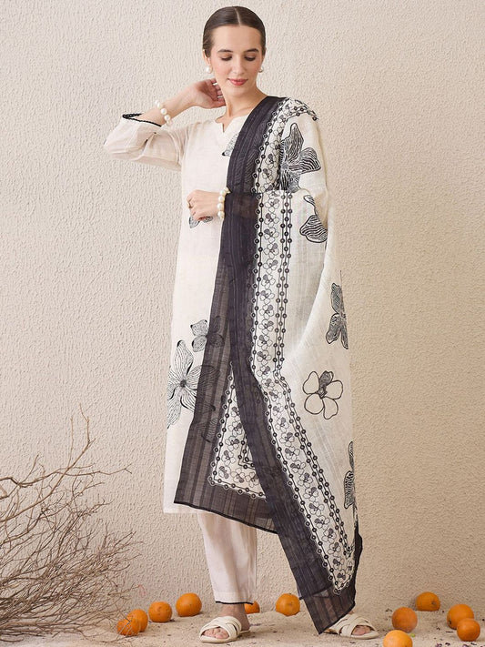 Dhiyona IE Floral Embroidered Linen Kurta with Trousers & Dupatta