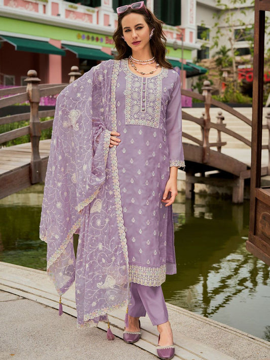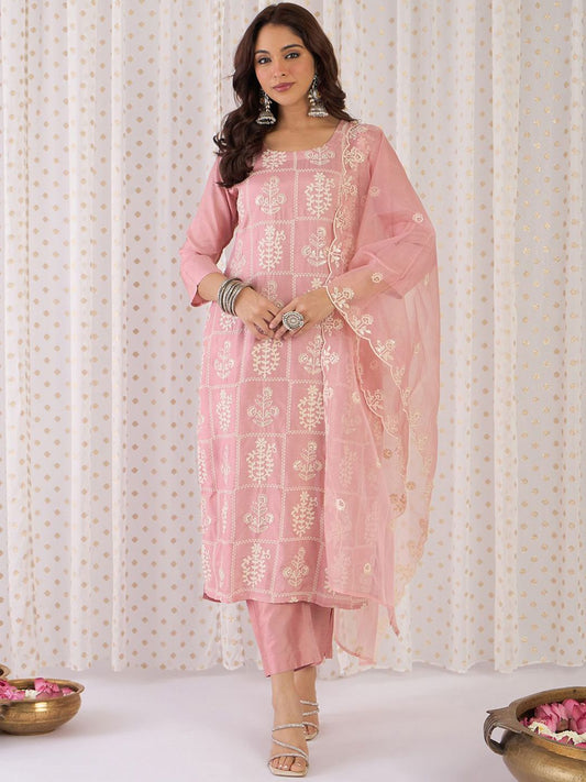 Dhiyona IE Floral Embroidered Round Neck Thread Work Organza Kurta With Trousers & Dupatta