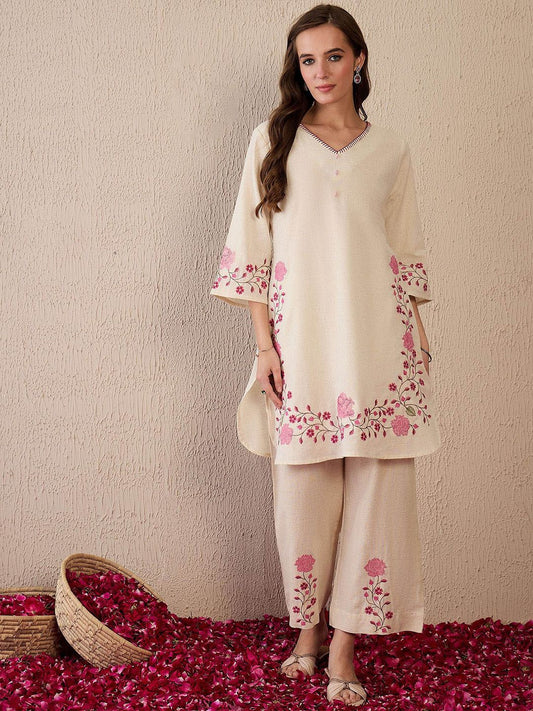 Dhiyona IE Floral Embroidered Thread Work Linen Kurta with Trousers & With Dupatta