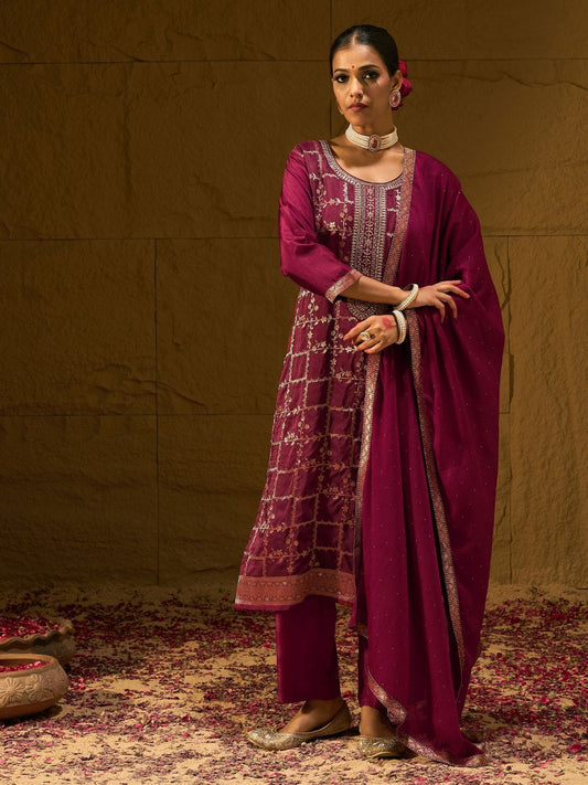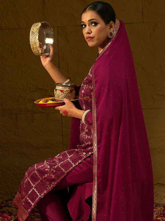 Dhiyona IE Floral Zari Embroidered Straight Kurta with Trouser & Dupatta