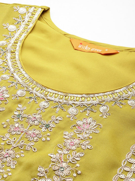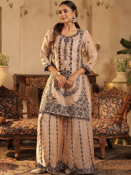 Dhiyona IE Ethnic Motifs Embroidered Chinon Beads And Stones Kurta With Palazzos & Dupatta