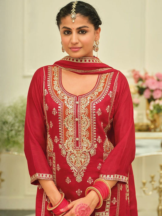 Dhiyona IE Ethnic Motifs Embroidered Chinon Beads & Stones Kurta With Palazzos & Dupatta