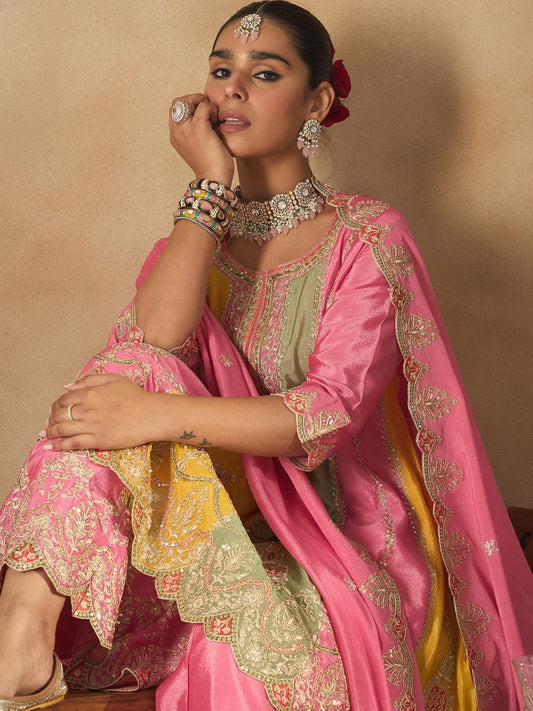 Dhiyona IE Floral Embroidered Sequinned Chinon Straight Kurta With Palazzos & Dupatta