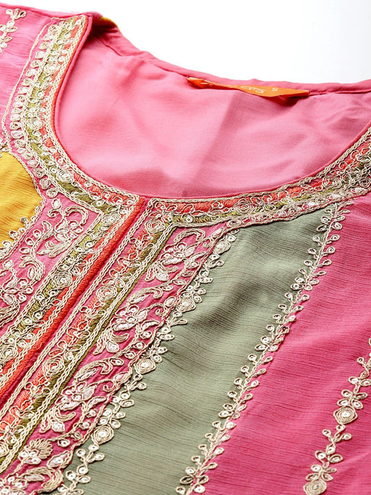 Dhiyona IE Round Neck Embroidered Sequinned Chanderi Silk Kurta with Trouser & Dupatta