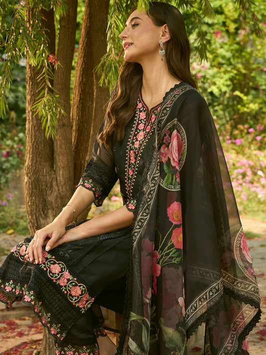 Dhiyona IE Black Floral Embroidered Thread Work Kurta with Trousers & Dupatta