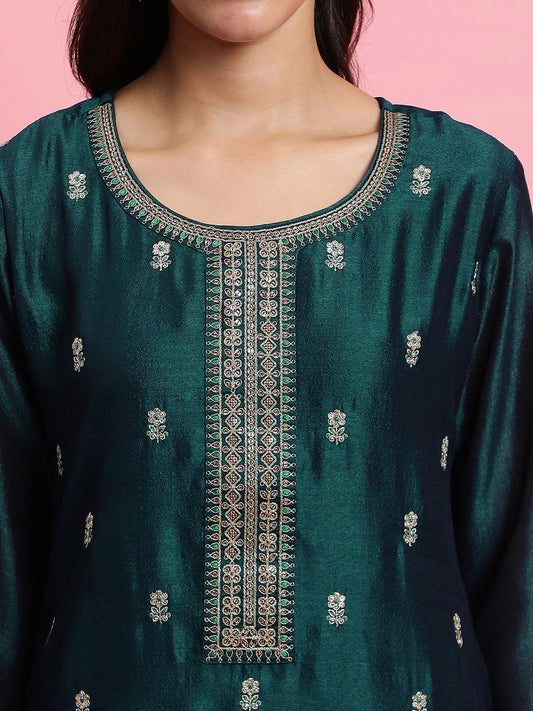 Dhiyona IE Women Turquoise Blue Floral Embroidered Mirror Work Chanderi Silk Kurta with Trousers & With